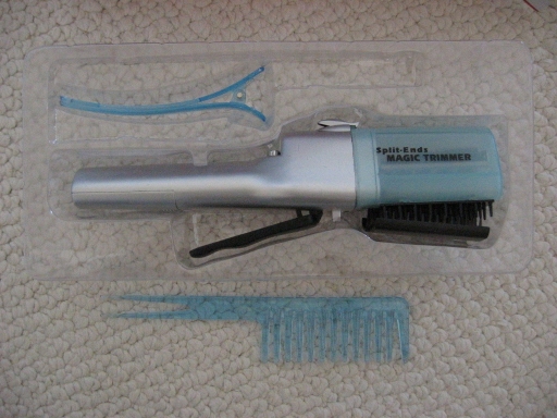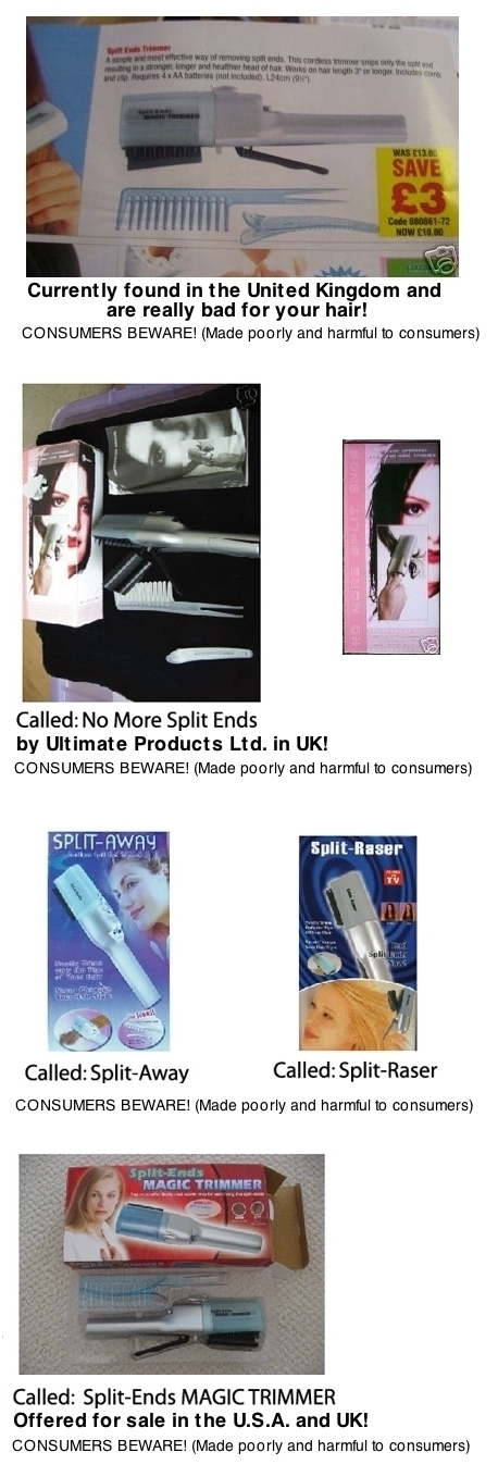 NOTE: This illegal copy of the Patented Split-Ender called "Split Ends Magic Trimmer" has being found at catalogs and retail stores in the United States and United Kingdom. Several so call "distributors" and individuals are under investigation!